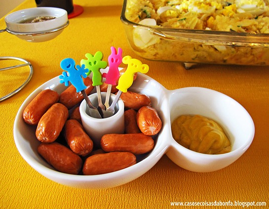 Em outra petisqueira menor, coloquei salsichas aperitivo defumadas com molho de mostarda Dijon. Aproveitei a oportunidade para usar 4 dos 8 garfinhos fofos que comprei na Alemanha e que tinham as cores da festa. Um deles é um coelhinho rosa, tudo a ver!