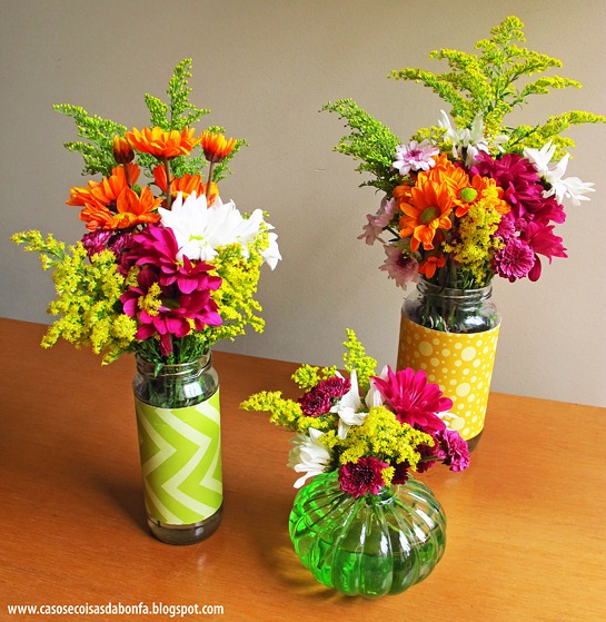 Como de costume, comprei flores frescas para decorar alguns vasos, entre eles, alguns potes de vidro de azeitonas e molho de tomate reciclados e customizados com as padronagens que criei especialmente para o Kit digital FESTA DA PÁSCOA.