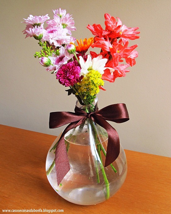 Esse arranjo ganhou um laço de fita marrom, que lembra chocolate. Uma dica para gastar menos com flores é comprar um bouquet já pronto e depois desmembrá-lo, preenchendo vários recipientes. Quando quero encher a casa de flores, normalmente recorro às lojas da COBAL DO HUMAITÁ.