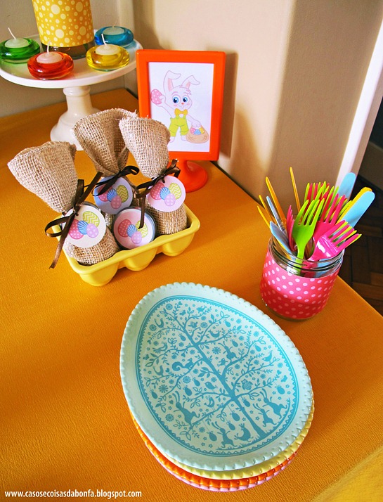 No lado direito da mesa, dispus uma petisqueira amarela em formato de caixa de ovos com as lembrancinhas da festa, mostradas no POST ANTERIOR. Para completar a decoração, usei um dos porta-retratos que minha mãe comprou na IKEA com a minha ilustração do coelhinho distribuindo ovinhos, pratos de sobremesa temáticos da WORLD MARKET e talheres coloridos descartáveis da JLM, inseridos em um pote de vidro customizado com uma das padronagens do kit FESTA DA PÁSCOA.