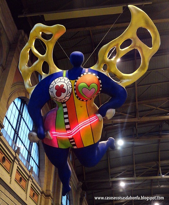 As cores vibrantes e dimensões generosas das peças em papier mâché me chamaram a atenção desde a primeira vez em que as vi. A da foto acima é intitulada Guardian Angel (Anjo da Guarda) e fica suspensa por fios no teto da estação de trem.