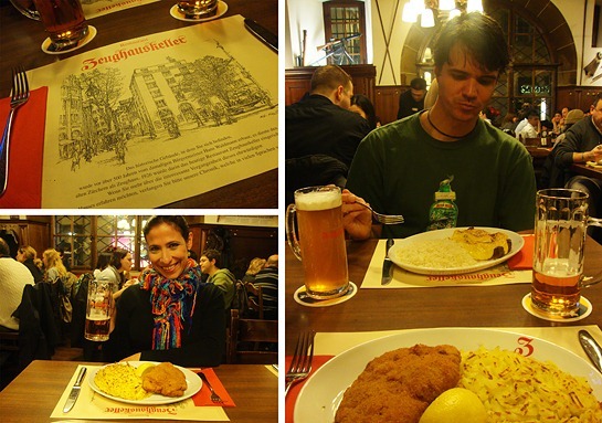 Depois de passear um pouco pelas ruas que se preparavam para abrigar a festa de Ano Novo, fomos jantar em um restaurante típico recomendado em nosso guia de viagem: o ZEUGHAUSKELLER. Experimentamos algumas cervejas fabricadas na casa enquanto eu comi o frango empanado com recheio de queijo gruyère e presunto, acompanhado de batata rösti (Cordon Bleu). Estava gostosinho, mas nada de mais. Já o prato de carne com molho de curry e alho do Marcelo (Möckli à la Zeughauskeller) estava sensacional!!!!