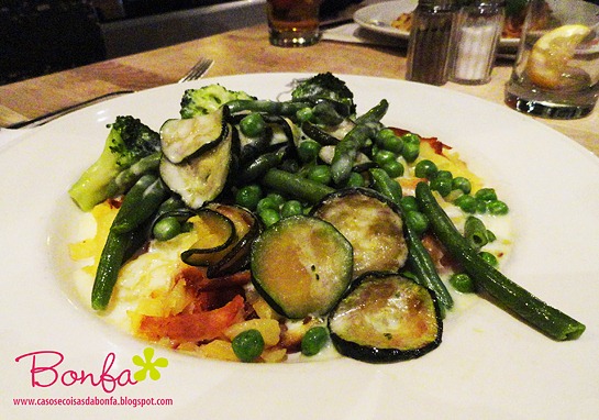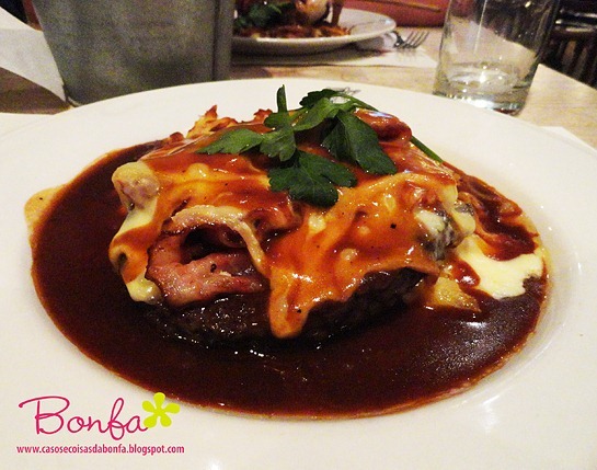 O meu prato estava bastante suculento e foi o mesmo do Thomas: filé mignon coberto por bacon e bastante queijo Gruyère ao molho de vinho tinto. Hummmmmm…era tão calórico quanto saboroso!!!!!