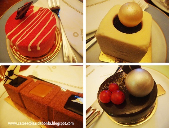 Eu normalmente opto por doce de frutas e pedi uma espécie de panacotta com frutas vermelhas (Monte Carlo), o Marcelo pediu um doce quadradinho branco que se assemelhava a uma mousse de baunilha com recheio de chocolate, a Carmen pediu um doce maravilhoso com chocolate meio amargo, caramelo e flor de sal e o Thomas optou por um de chocolate com recheio de frutas vermelhas. Estavam todos bem gostosos, mas o da Carmen foi o campeão pela textura, apresentação e sabor equilibrado.