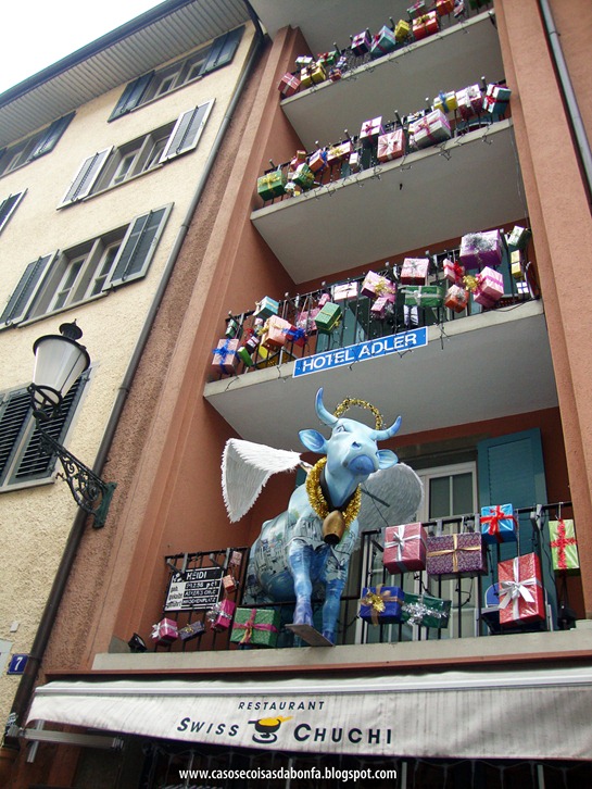 Mais adiante, a fachada do Hotel Adler me chamou a atenção por ter suas varandas decoradas com muitos presentes e uma vaca-anjinho fofa e divertida!!!!